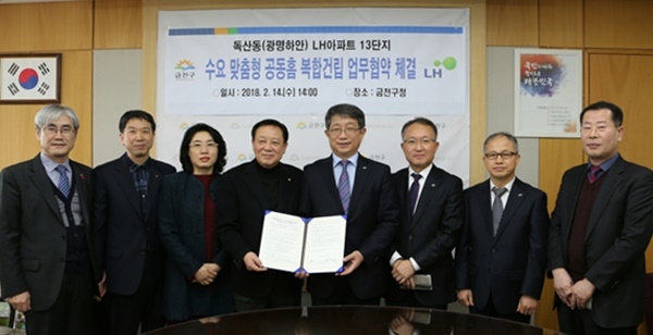 한국토지주택공사(LH)가 14일 서울시 금천구청과 독산동에 위치한 광명하안13 영구임대아파트 단지 내 공동홈 복합건립 추진을 위한 업무협약을 체결했다.