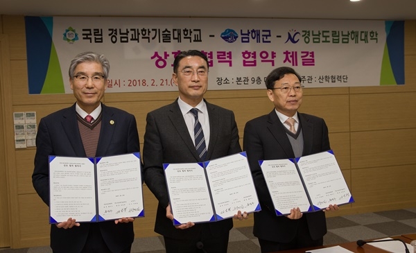 경남과학기술대학교가 21일 대학본부 대회의실에서 남해군, 경남도립남해대학과 다문화 가정 및 취약계층 주거환경 개선을 위한 관학협정을 체결했다.