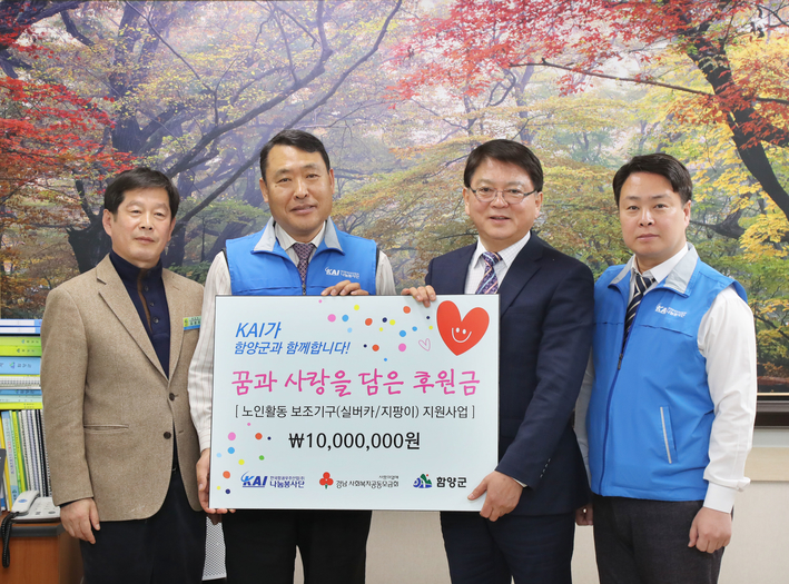 한국항공우주산업(주) KAI 나눔봉사단이 28일 경남 함양군청을 방문해 사회 복지사업비 1천만원을 강현출 부군수에게 전달했다.