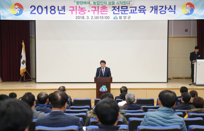 함양군은 2일 농업기술센터 농업인교육관에서 강현출 부군수를 비롯해 교육생 100명 등 120여명이 참여한 가운데 2018년 귀농·귀촌 전문교육 개강식을 열었다.