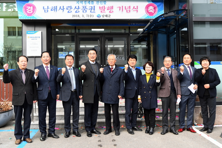 경남 남해군이 7일 NH농협은행 남해군지부 앞에서 남해사랑상품권 최초 발행일에 맞춰 기념행사를 열었다.