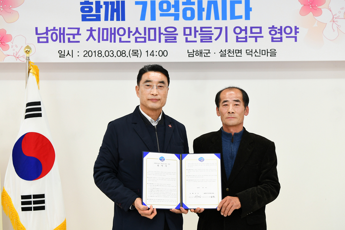 경남 남해군이 군내 설천면 덕신마을과 ‘치매안심마을 만들기’ 업무 협약을 8일 덕신마을회관에서 체결했다.
