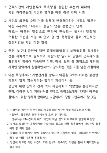 이 시장은 “공인에 대한 중대범죄 행위나 부패행위를 감시하는 것은 바람직하지만 단순 근무 태도를 확인하기 위해 지속적인 미행‧잠복‧촬영 등 사적 영역까지 침범하면서 감시하는 것은 도를 넘은 사찰”이라고 주장했다.