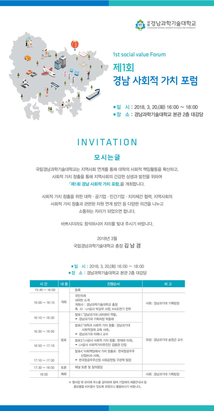 경남과학기술대학교 USR센터가 오는 20일 오후 4시 학내 본관 2층 대강당에서 ‘제1회 경남 사회적 가치 포럼’(이하 포럼)을 개최한다.
