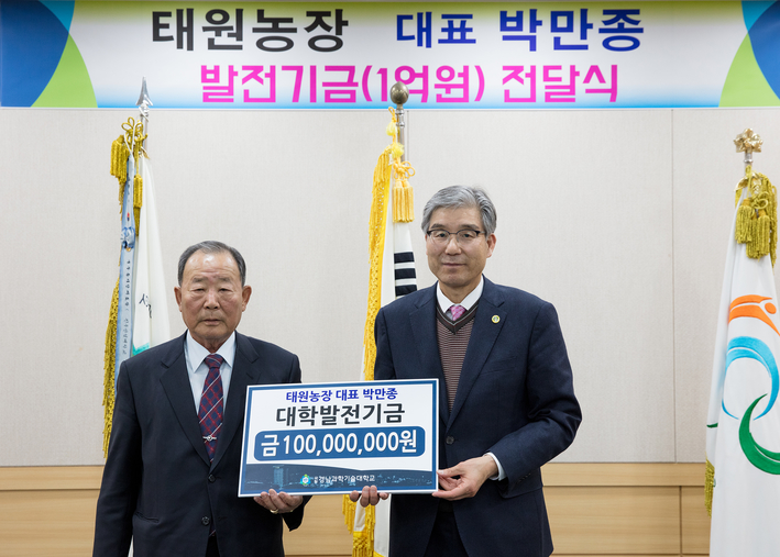 경남과학기술대학교(총장 김남경)는 태원농장(진주시 수곡면) 박만종(사진 왼쪽) 대표가 대학 발전기금으로 1억 원을 전달했다고 20일 밝혔다.