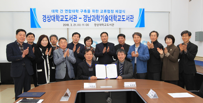 경상대학교 도서관과 경남과학기술대학교 도서관이 21일 경상대학교 중앙도서관 회의실에서 ‘연합대학 구축을 위한 교류협정 체결식’을 열었다.
