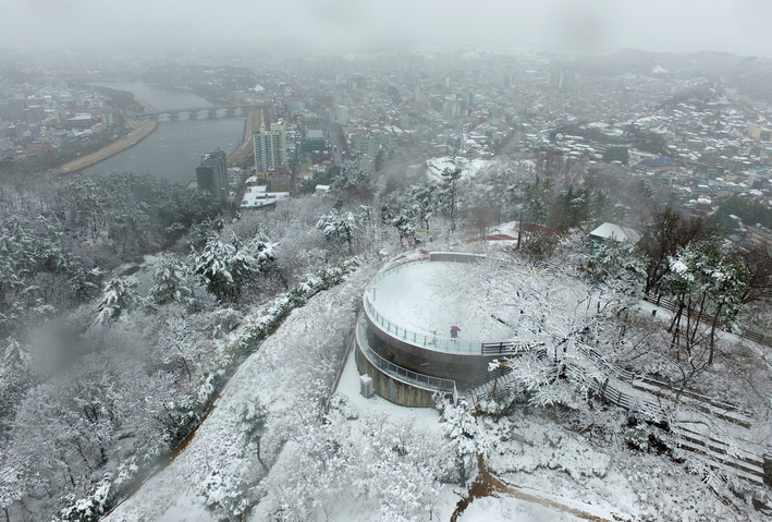 [포토뉴스] 눈 내린 진주 남강과 선학산전망대