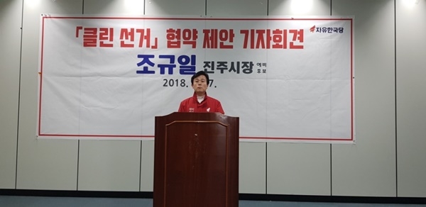경남 진주시장 출마를 선언한 조규일 전 경상남도 서부부지사(55, 자유한국당)가 27일 오전 진주시청 브리핑룸에서 기자회견을 열고 ‘공명선거’ 협약을 다른 후보들에게 제안했다.
