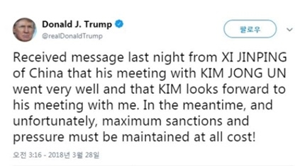 트럼프 대통령은 28일 오전(현지시간) 트위터를 통해 “지난밤 중국 시진핑 주석으로부터 김정은 위원장과의 만남이 매우 잘 이뤄졌고, 김 위원장이 나와의 만남을 고대하고 있다는 메시지를 전달받았다”고 밝혔다.
