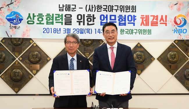 경남 남해군과 KBO(Korea Baseball Organization·한국야구위원회)가 양 기관의 긴밀한 상호 협력을 위해 손을 맞잡았다.