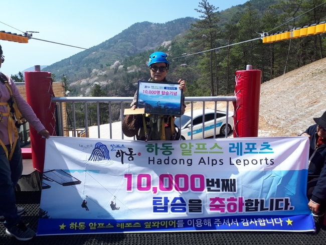 짚와이어를 운영하는 하동알프스레포츠는 1만 번째 주인공인 임명숙(대구)씨에게 기념패와 30만원 상품권을, 9999번째와 1만 1번째 탑승객에게는 10만원 상품권을 증정했다.