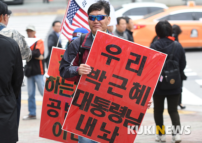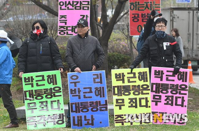 선고가 있는 날 법원 주변은 박 대통령의 석방을 요구하는 이들의 집회로 혼잡을 빚었다. 경찰차가 차량 통행로를 막아선 가운데 참가자들은 태극기와 성조기를 흔들며 시위를 이어나갔다.
