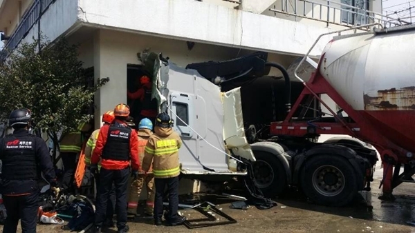제주소방서에 따르면 이날 오전 11시 36분경 도평동의 한 레미콘 제조 공장에서 레미콘 차량이 공장 건물을 향해 돌진했다.