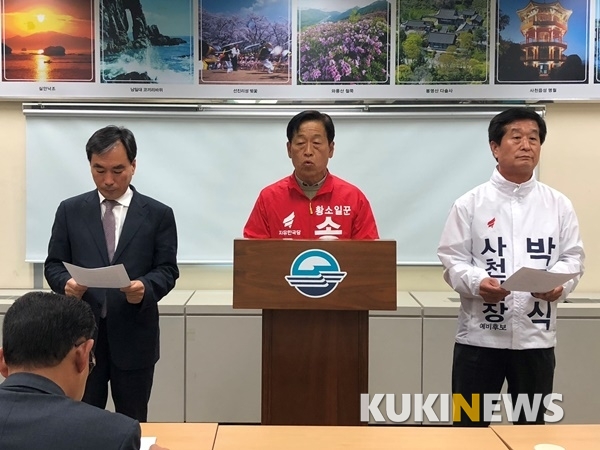 박동식 전 경남도의회 의장과 이종범 사천시의회 부의장, 송영곤 전 창녕군수는 9일 사천시청 브리핑룸에서 송 시장의 공천 취소를 촉구하는 기자회견을 열었다.