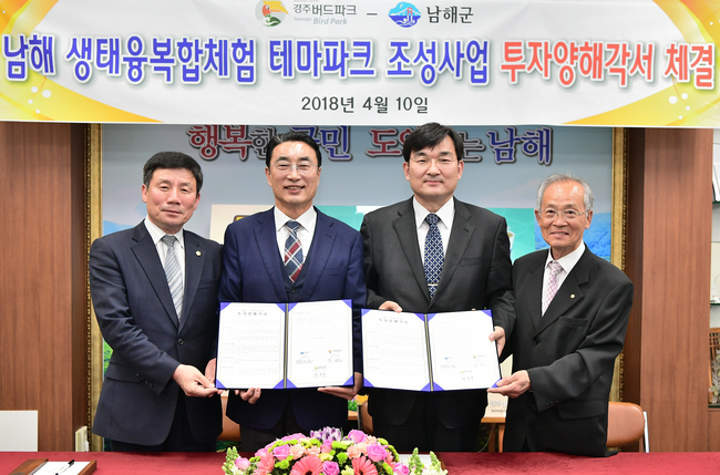 경남 남해군과 ㈜경주버드파크가 오는 2026년까지 생태융복합체험 테마파크 조성을 골자로 하는 투자양해각서(MOU)를 10일 남해군청에서 체결했다.