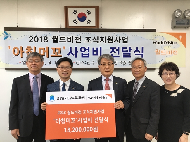 경상남도진주교육지원청이 10일 진주교육청에서 월드비전경남지역본부와 취약계층 청소년의 조식지원을 위한 ‘아침머꼬’사업비 전달식을 가졌다.