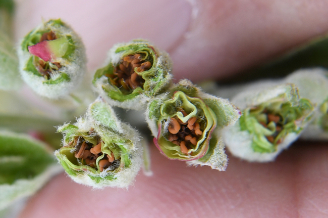 사과꽃 봉우리 속에 암술과 수술이 얼어서 갈색으로 변해 수정을 할 수 없는 상태다.