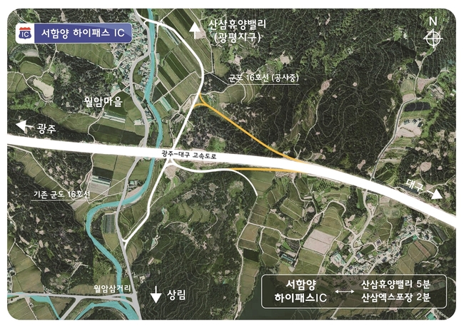 신설되는 서함양 하이패스 IC는 광주∼대구 고속도로 91.8㎞ 지점인 병곡면 월암삼거리 부근으로 대구방면 진·출입 시설 1개소씩 설치되며, 현재 공사 중인 군도 16호선과 연결된다.