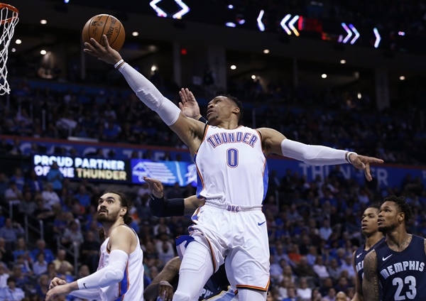 오클라호마시티 선더의 웨스트브룩은 12일(한국시간) 미국 오클라호마 주 오클라호마시티의 체서피크 에너지아레나에서 열린 2017-2018 NBA 정규리그 마지막 경기에서 멤피스 그리즐리스를 상대로 6득점 20리바운드 18어시스트를 기록했다.