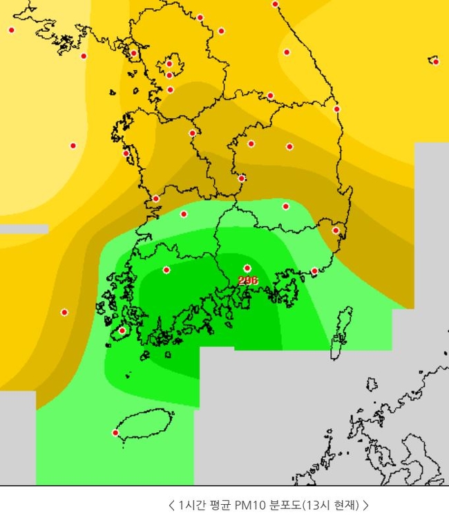 기상청의 1시간 평균 미세먼지(PM10) 농도 현황을 보면, 15일 오후 1시 기준 진주는 296㎍/㎥로 전국에서 최고 수치를 기록했다.
