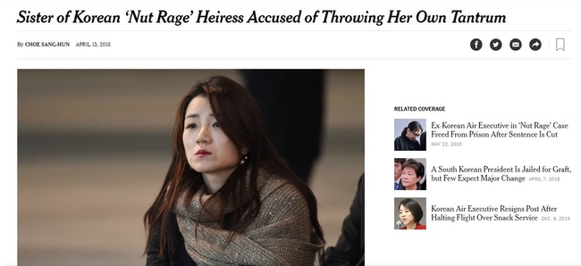 NYT는 이날 보도에서 '재벌(Chaebol)'과 '갑질(Gapjil)'이라는 단어를 한국어 그대로 표현했다. "한국에서 재벌 가족은 부패 스캔들이나 형제간 싸움에 끊임없이 얽혀왔다"며 "봉건시대 영주처럼 간부들이 부하 직원이나 하청업자를 괴롭히는 갑질행위를 하고 있다"고 말했다.