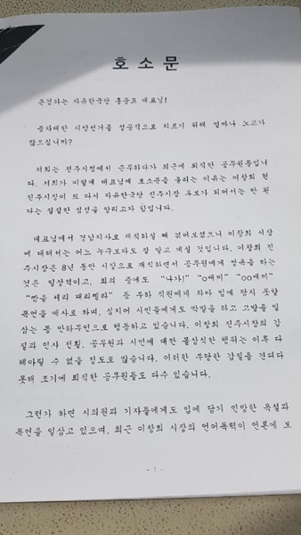 이들은 또한 “진주시청에 근무하는 1600여 후배 공무원들 역시 지금 말도 못하고 속앓이만 하고 있고 직접 나설 수는 없지만 저희들과 뜻을 같이하고 있다”면서 “진주시 공무원들은 이 시장의 종속물이 아니며 모두 고귀한 인격의 소유자이자 한 가정의 가장들이다”고 강조했다.