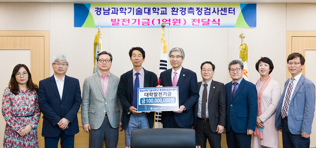 경남과학기술대학교 환경측정검사센터(센터장 환경공학과 이춘식 교수)가 17일 오전 총장실에서 김남경 총장에게 대학 발전기금 1억원을 전달했다.