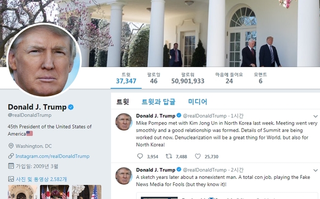 도널드 트럼프 미국 대통령이 18일(현지시간) 트위터를 통해 마이크 폼페오 미국 국무장관 내정자와 김정은 국무위원장이 지난주 북한에서 비핵과 관련 극비 면담을 가졌다고 밝혔다.