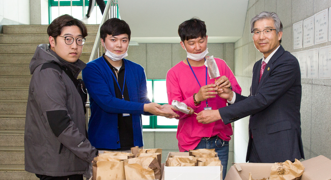 김남경 총장을 비롯한 보직교수와 도서관 직원, 총학생회 간부 등 10여명은 간식 나눔에 참여해 재학생 250여명에게 핫도그와 콜라를 전달했다.