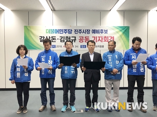 더불어민주당 진주시장 후보 공천경쟁을 벌이고 있는 갈상돈·김헌규 예비후보가 지역권력 교체를 위해 함께 노력하겠다고 밝혔다.