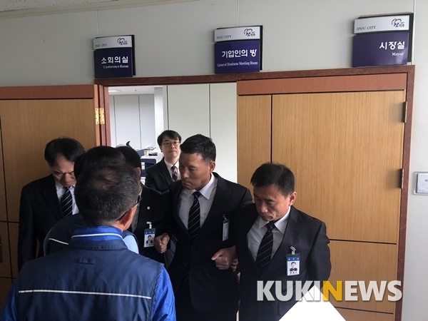 하지만 시청 청원경찰과 공무원들이 시장실 입구를 가로막았고, 이 과정에서 고성이 오가며 몸싸움이 벌어졌다.