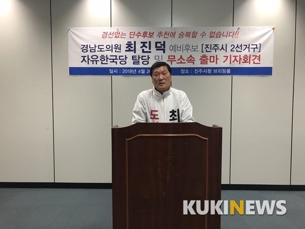 최 예비후보는 26일 진주시청 브리핑룸에서 기자회견을 열고 “지금까지 몸담고 있던 자유한국당을 탈당하고 비통한 심정으로 무소속으로 경남도의원에 출마한다”고 밝혔다.