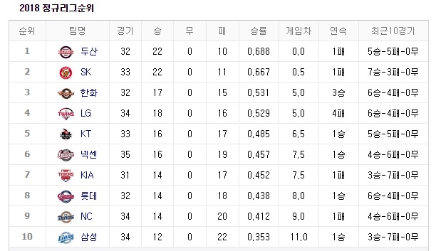 타선이 불을 뿜고 있는 SK 와이번스는 22승 11패로 두산을 0.5게임 차 추격 중이다. 그 뒤로는 한화, LG, KT, 넥센 등이 자리했다.