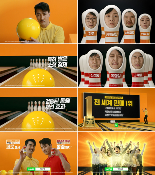 시선을 사로잡는 샛노란 볼링공은 액티넘의 특허 받은 9.2mm 의 노란색 소형정제를 의미한다. 또한, 볼링핀을 피로통증 증상들로 경직되어 있는 사람들로 의인화하여 액티넘으로 피로 통증이 사라져 행복해 하는 모습을 표현했다.