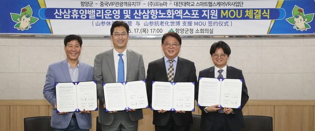 경남 함양군이 중국 거대 투자관리 및 유통전문 그룹과 국내 항노화·콘텐츠 전문 업체간 MOU 체결식을 17일 열었다.