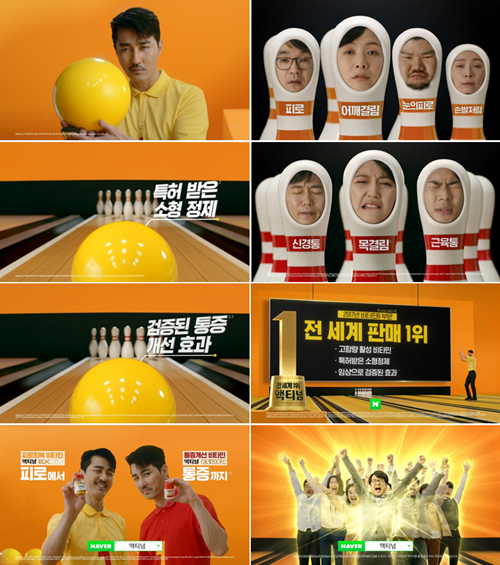 시선을 사로잡는 노란볼링공은 액티넘의 특허 받은 9.2mm의 노란색 소형정제를 의미한다. 또 볼링핀을 피로통증 증상들로 경직되어 있는 사람들로 의인화해 액티넘으로 피로통증이 사라져 행복해하는 모습을 표현했다.
