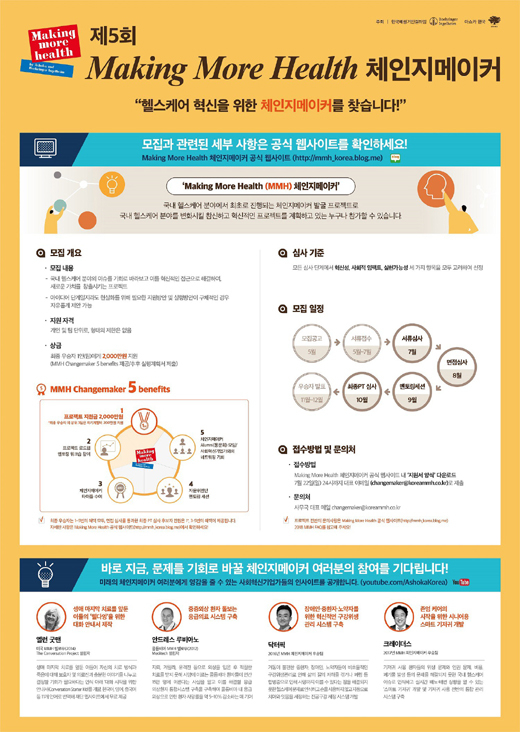 아쇼카 한국 이혜영 대표는 “메이킹 모어 헬스(Making More Health) 체인지메이커는 5회를 맞는 동안 유망한 체인지메이커 팀을 선발해 국내외 의료보건 분야 사회혁신 트렌드 공유, 전문가 그룹 멘토링 등을 통해 아이디어의 실행 및 확산을 지원하고 있다. 올해도 잠재력을 지닌 혁신가들의 많은 관심과 지원이 이어지길 바란다”고 말했다.