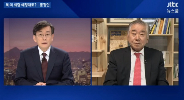 문정인 대통령 외교안보특보(연세대 특임교수)는 23일 JTBC 뉴스룸에 출연해 한미정상회담에서 나온 트럼프의 발언에 대해 의견을 냈다.