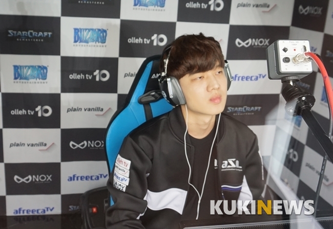 정윤종과 장윤철은 27일 오후 5시 서울 삼성동 코엑스 K-POP 광장에서 올레 tv 아프리카TV 스타리그(ASL) 시즌5 결승전 대결을 펼친다. 1세트 승리 후 정윤종이 생각이 잠겨 있다.