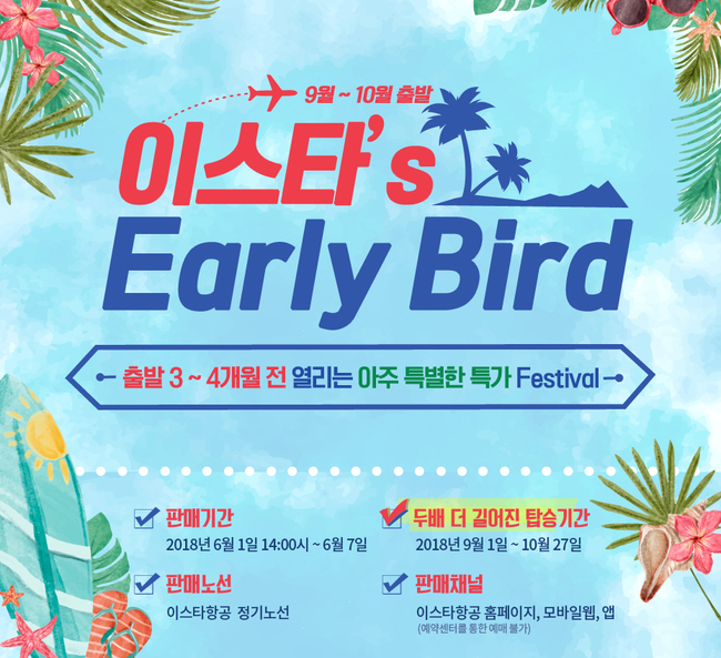 이스타항공이 6월 1일부터 7일까지 일주일간 얼리버드 특가 이벤트를 통해 9월, 10월 출발 항공편 특가 이벤트를 진행한다.