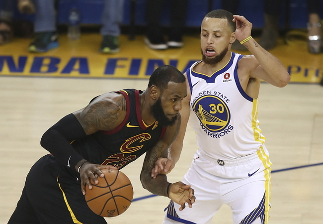 결승전에 임하는 양 팀, 클리블랜드 캐블리어스와 골든 스테이트 워리어스는 미국 캘리포니아주 오클랜드 오라클 아레나에서 열린 2017/2018 NBA 결승전 1차전에서 56-56 동점으로 전반전을 마쳤다.