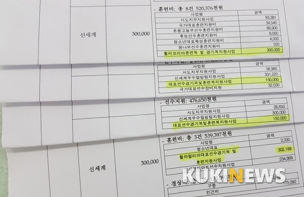 컬링연맹은 2012년 9월부터 휠라코리아와 후원 협약을 맺고 무상으로 훈련복 및 경기복을 지원받았다. 지원 품목은 경기복, 훈련복, 가방, 신발, 런닝화 등이다. 협약 후 컬링 대표팀은 평창동계올림픽을 비롯한 각종 국제대회에서 휠라 경기복을 입고 뛰었다. 결국 컬링연맹이 ‘대표팀 경기복 및 훈련복 지원사업’으로 기재한 9억원은 허위인 셈이다.