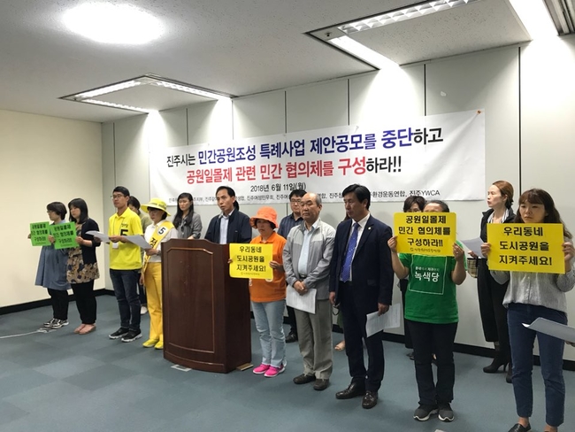 민족문제연구소 진주지부, 진주같이, 진주아이쿱생협, 진주여성민우회, 진주여성회, 진주진보연합, 진주참여연대, 진주환경운동연합, 진주YWCA 등은 11일 진주시청에서 기자회견을 열고 “2020년 도시공원 일몰제가 적용되는 진주지역 공원은 21곳인데 진주시는 가좌공원, 장재공원을 민간업자가 부지의 30%를 아파트로 개발하고 나머지 70%를 공원으로 조성, 기부 채납하는 방식인 민간공원특례제도로 사업을 추진하고 있다”고 밝혔다.