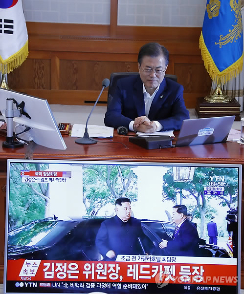 문 대통령은 이날 오전 10시 청와대에서 주재한 국무회의에 앞서 TV를 통해 김 위원장이 센토사섬 카펠라 호텔 내 회담장으로 입장하는 장면 등을 지켜봤다.