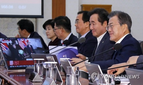 문 대통령은 이낙연 국무총리 등 국무위원들과 함께 김정은 북한 국무위원장과 도널드 트럼프 미국 대통령의 역사적인 첫 만남을 생중계로 지켜봤다. 이로 인해 오전 10시 예정이던 국무회의를 12분가량 늦춰졌다.