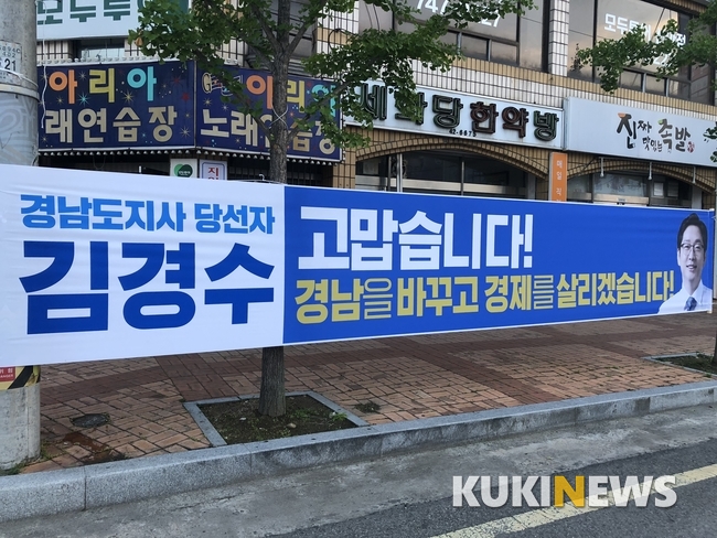 6.13 지방선거에서 당선된 김경수 경남도지사 당선자의 인사 펼침막이 진주시 거리에 걸렸다.