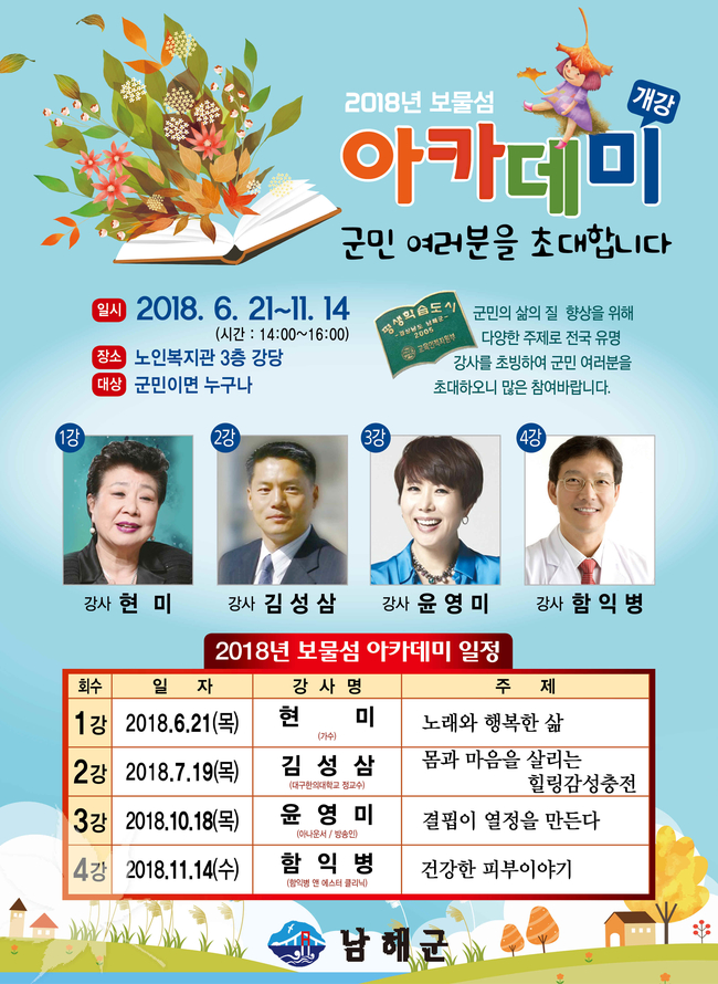 남해군은 오는 21일 오후 2시 노인복지관 3층 강당에서 가수이자 명문에듀케이션 대표강사로 활동하고 있는 현미 씨를 초청해 2018년 보물섬 아카데미 제1강을 개최한다.