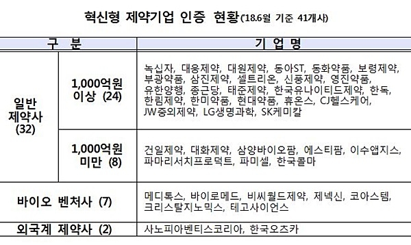 주요 안건 심의·의결결과에 따르면 2015년에 혁신형 제약기업으로 인증(’18.6.19. 만료)된 기업 31개사에 대해 3년간 인증을 연장(‘18.6.20.~’21.6.19.)하기로 의결했다. 인증 유효기간은 3년이며, 인증 연장 심사를 거쳐 3년 단위로 연장이 가능하다.