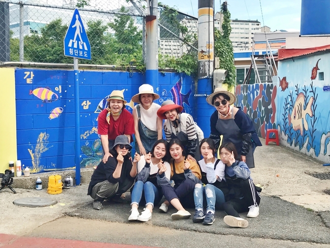‘청년, 도시를 채색하다’ 프로젝트에 참여한 출연진은 하미경 서양화가, 남해대학 학생 4명과 함께 벽화를 그렸다.
