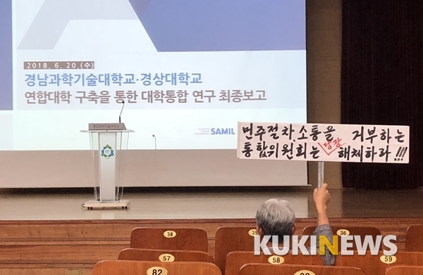 하지만 이날 연구용역 결과 발표에 대해 경남과기대 교수회는 피켓시위를 벌이며 반대했고, 총학생회도 부실한 정보제공에 우려를 나타냈다.